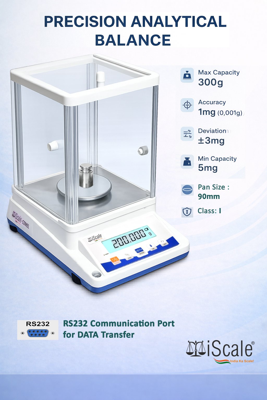 iScale Cerkel i-34 Precision Analytical Balance 300g x 0.001g (1mg) | Repeatability ±3mg (0.003) | NABL Calibration Certificate & 200g Test Weight | Ideal for Gold Jewellery, Lab & Research purpose | RS232 Serial output for PC connectivity