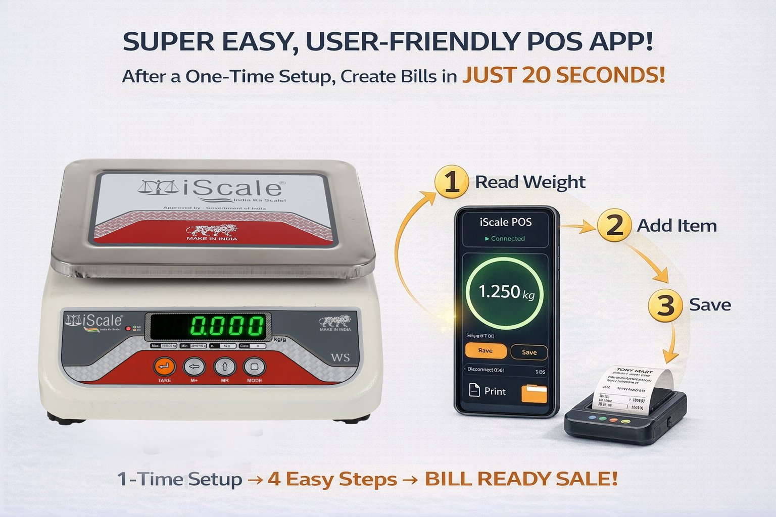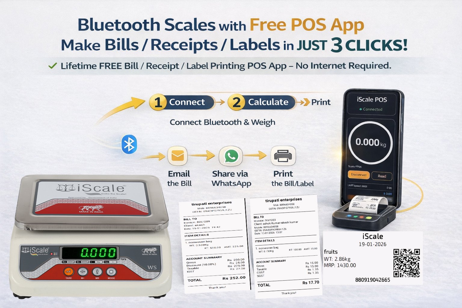 - Bluetooth connectivity for mobile and PC: Displays live weight on Android smartphones and Windows PCs using a lifetime free iScale POS app. Create receipts, invoices and MRP labels within 10–20 seconds in just 3 clicks using an simple-to-use app. Supports printing of bills and labels with scannable QR codes through the same app using a wireless Bluetooth thermal printer (printer not included). Suitable for billing, monitoring and digital record saving. Works completely offline, no internet required.