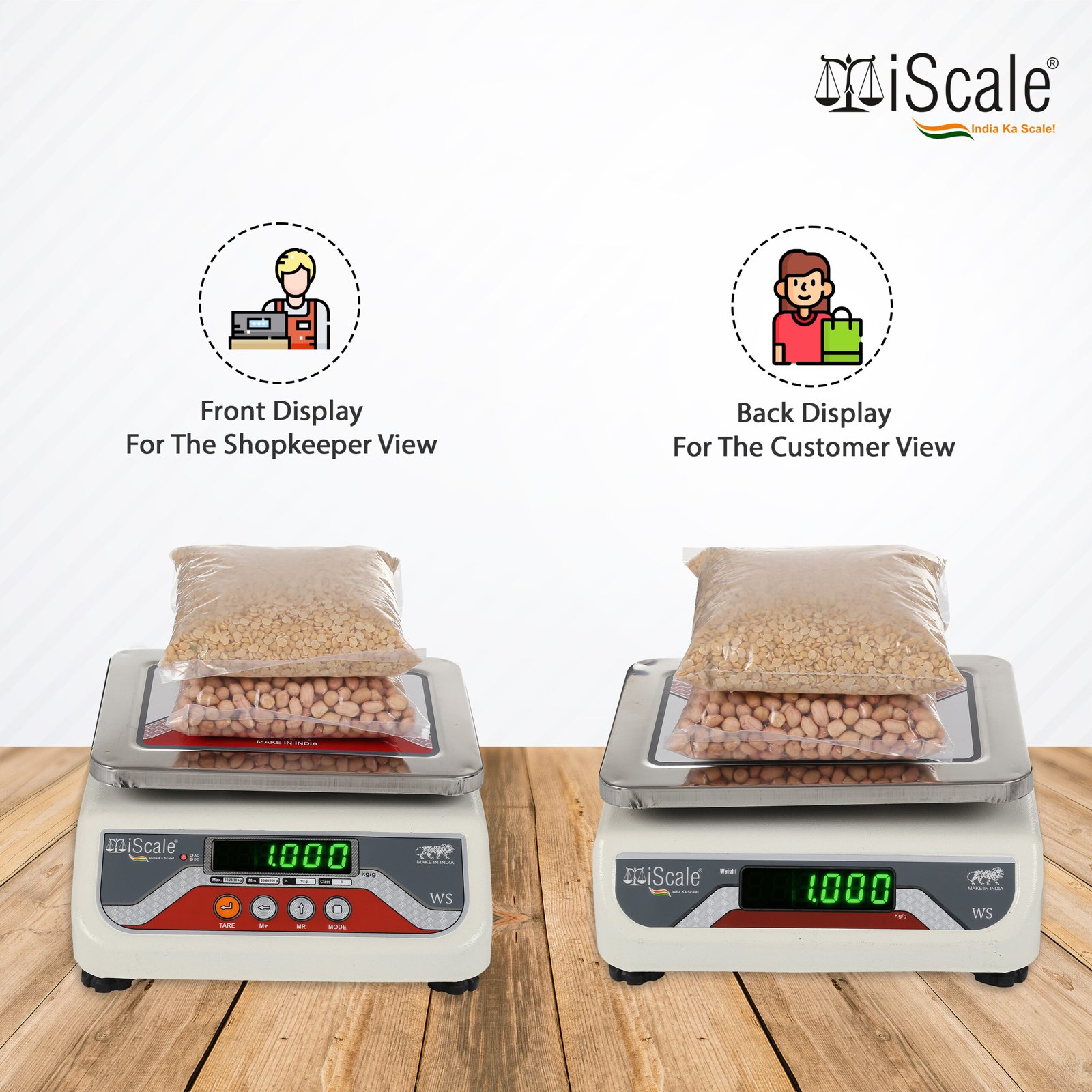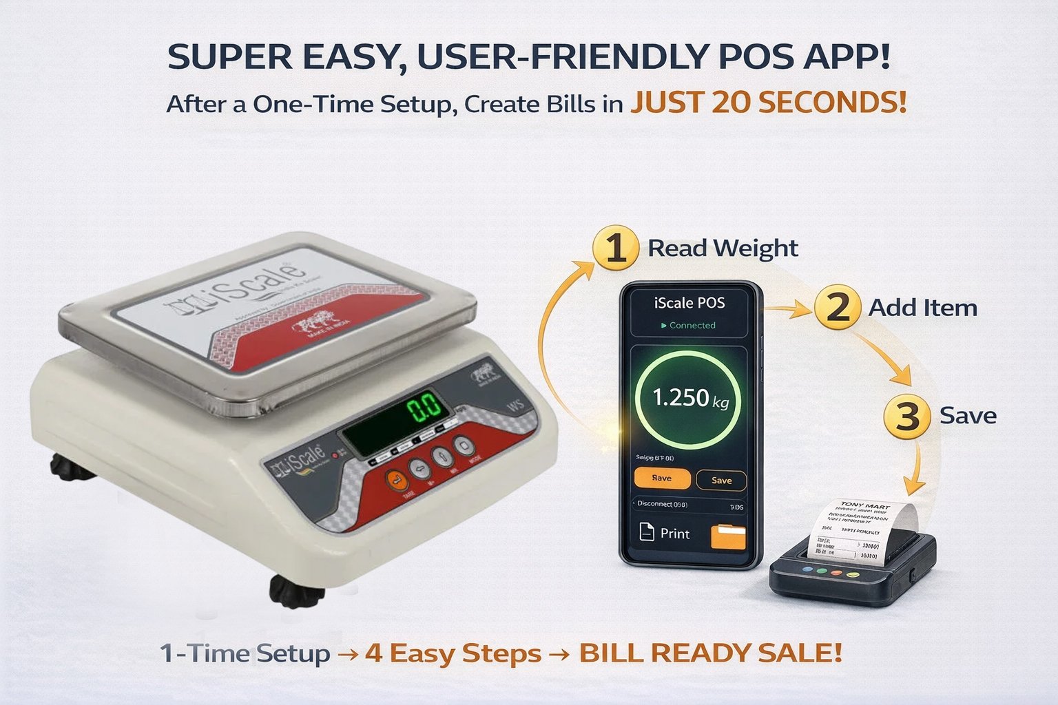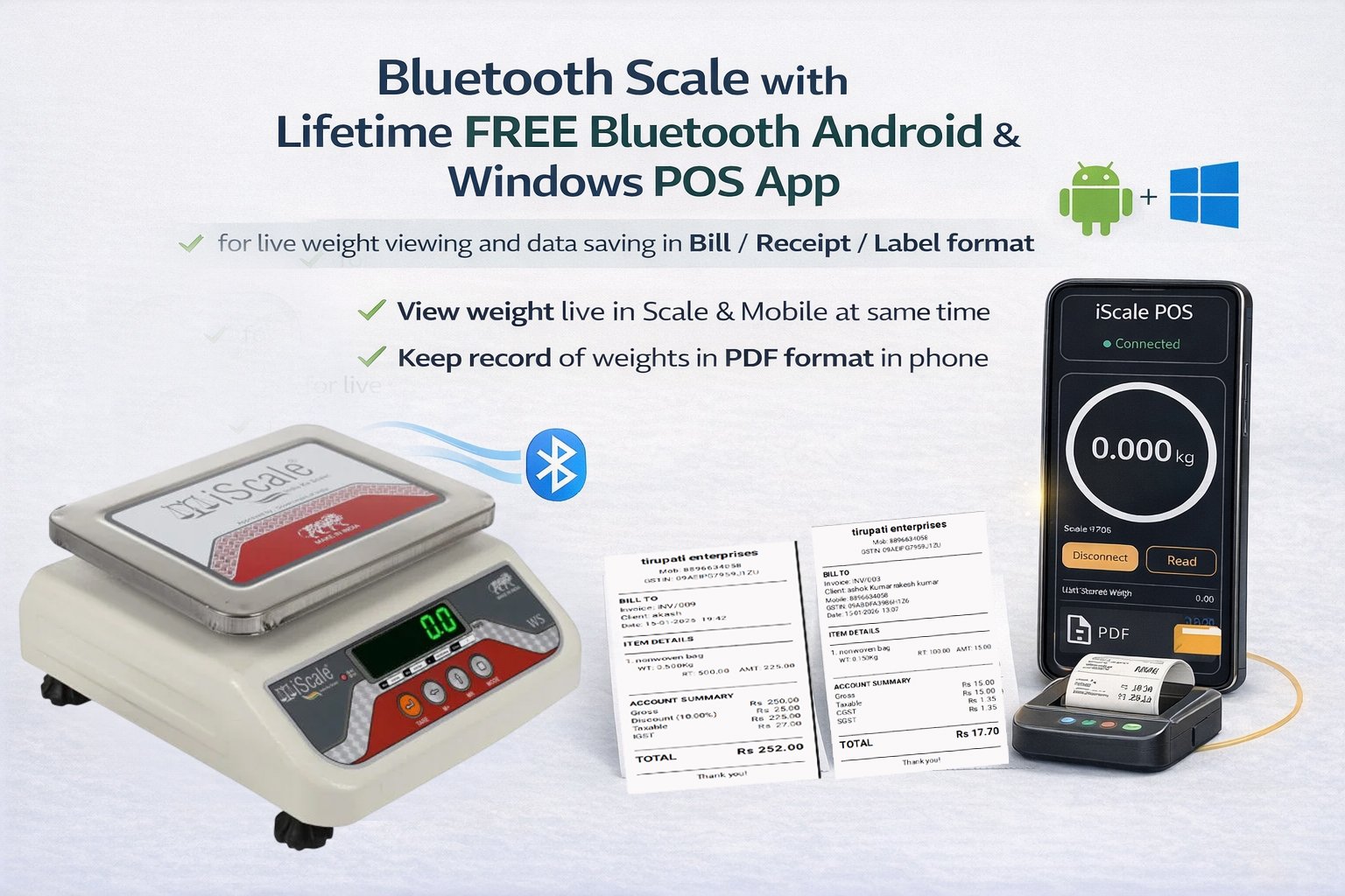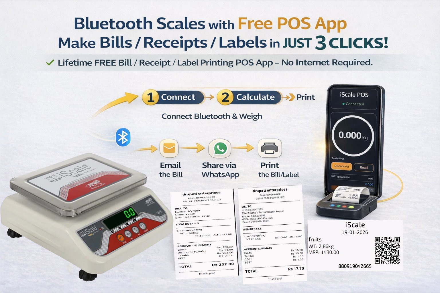 • Bluetooth connectivity for mobile and PC: Displays live weight on Android smartphones and Windows PCs using a lifetime free iScale POS app. Create receipts, invoices and MRP labels within 10–20 seconds in just 3 clicks using an simple-to-use app. Supports printing of bills and labels with scannable QR codes through the same app using a wireless Bluetooth thermal printer (printer not included). Suitable for billing, monitoring and digital record saving. Works completely offline, no internet required.