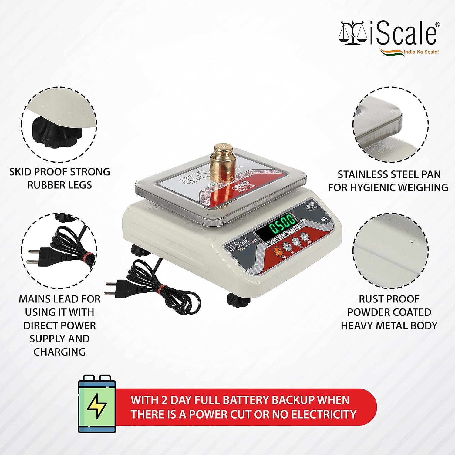 - Power: Directly Plug-in 220V Power Cord. There is also power backup of 2 days as it has in-built non-spill able lead acid battery. When the power is 100%, the standby time is about 6 months. The scale will also automatically switch to power saver mode when it is in non-use condition, to save power.