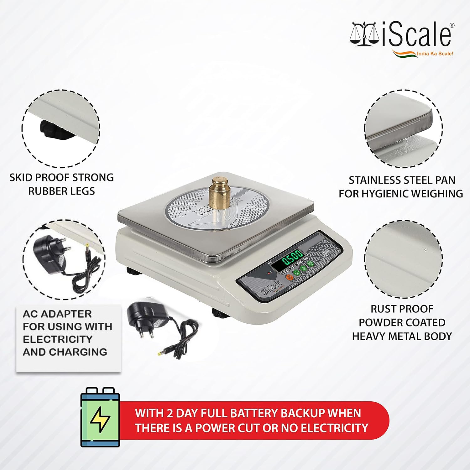 - Portable and safe: Directly Plug-in 220V Power Cord. There is also power backup of 2 days as it has in built non-spill able lead acid battery. When the power is 100%, the standby time is about 6 months. The scale will also automatically switch to power saver mode when it is in non-use condition, to save power.