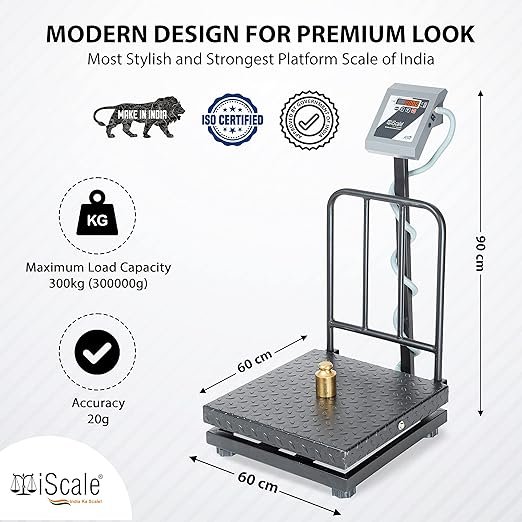 - Heavy-duty platform and accuracy: Mild-steel platform measuring 600 × 600 mm with maximum capacity 300 kg, precision 50 g and minimum weighing 200 g. Supplied with calibration / verification certificate.