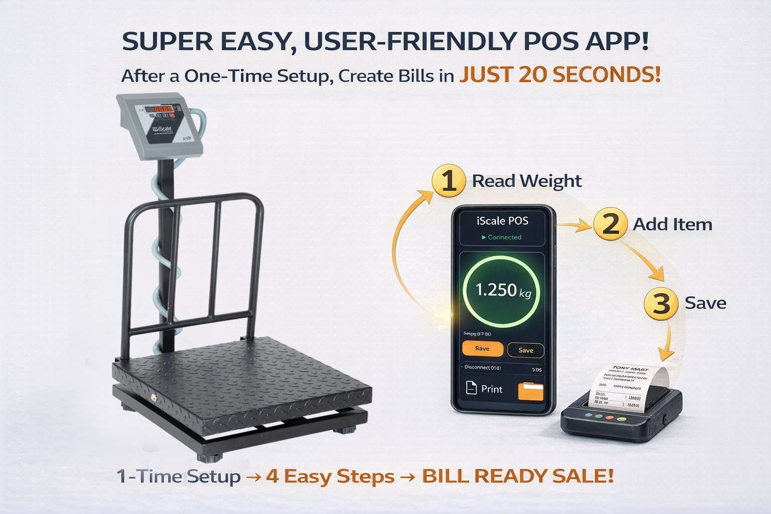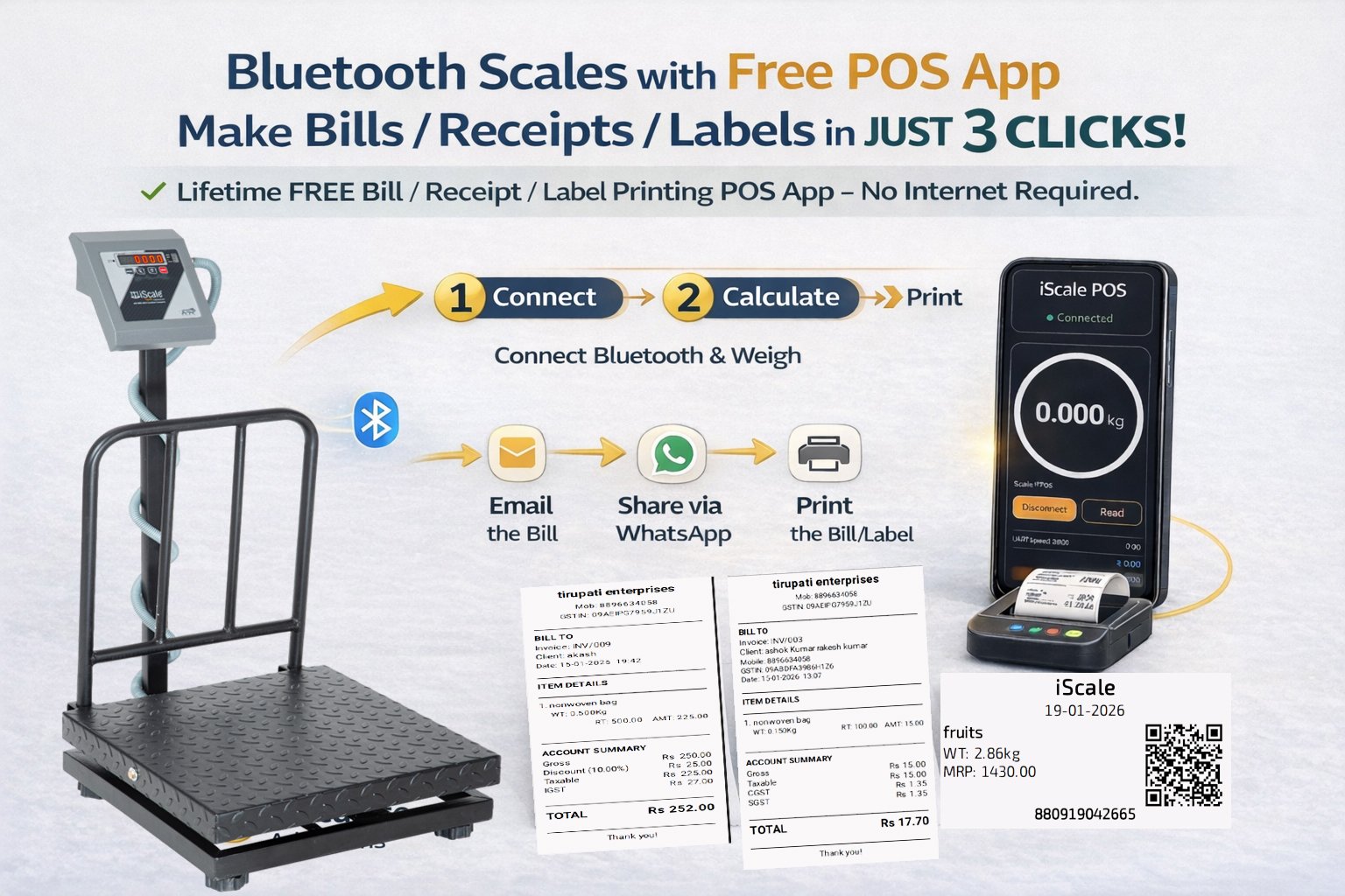 - Bluetooth connectivity for mobile and PC: Displays live weight on Android smartphones and Windows PCs using a lifetime free iScale POS app. Create receipts, invoices and MRP labels within 10–20 seconds in just 3 clicks using an simple-to-use app. Supports printing of bills and labels with scannable QR codes through the same app using a wireless Bluetooth thermal printer (printer not included). Suitable for billing, monitoring and digital record saving. Works completely offline, no internet required.