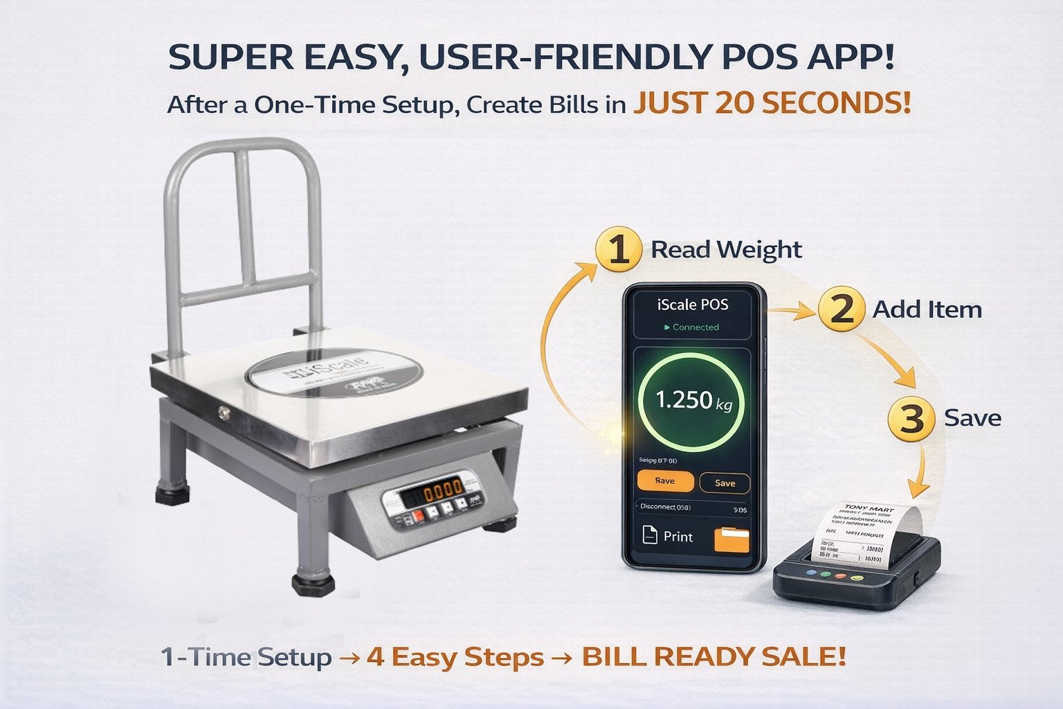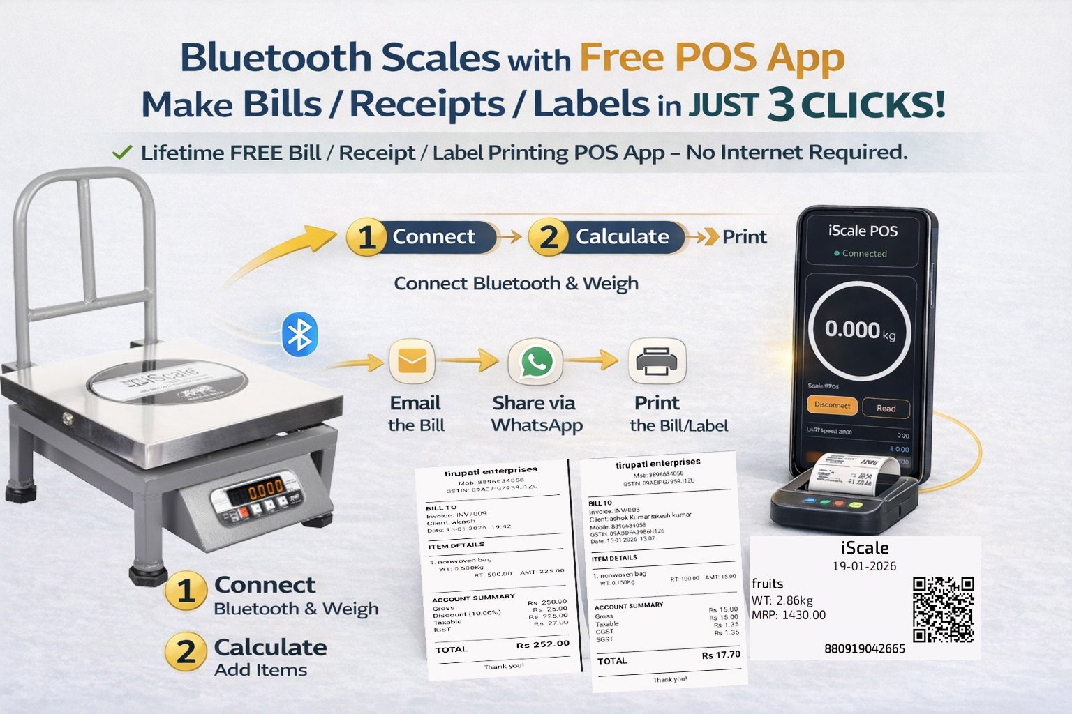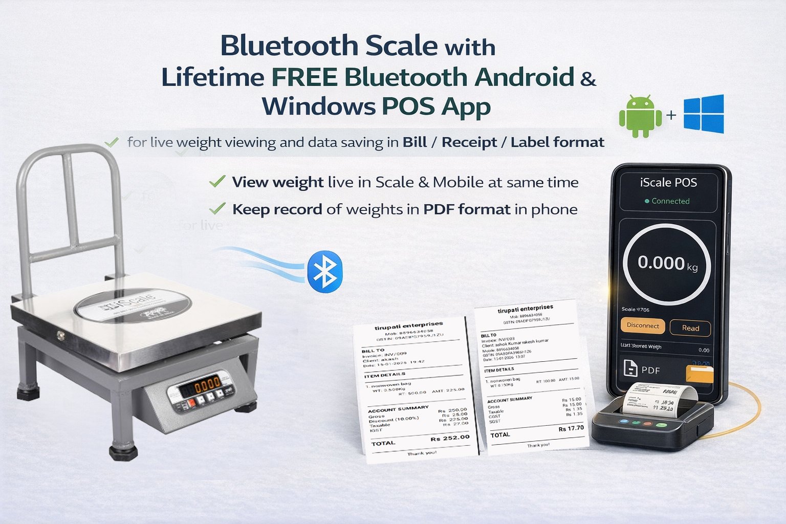 - Bluetooth connectivity for mobile and PC: Displays live weight on Android smartphones and Windows PCs using a lifetime free iScale POS app. Create receipts, invoices and MRP labels within 10–20 seconds in just 3 clicks using an simple-to-use app. Supports printing of bills and labels with scannable QR codes through the same app using a wireless Bluetooth thermal printer (printer not included). Suitable for billing, monitoring and digital record saving. Works completely offline, no internet required.