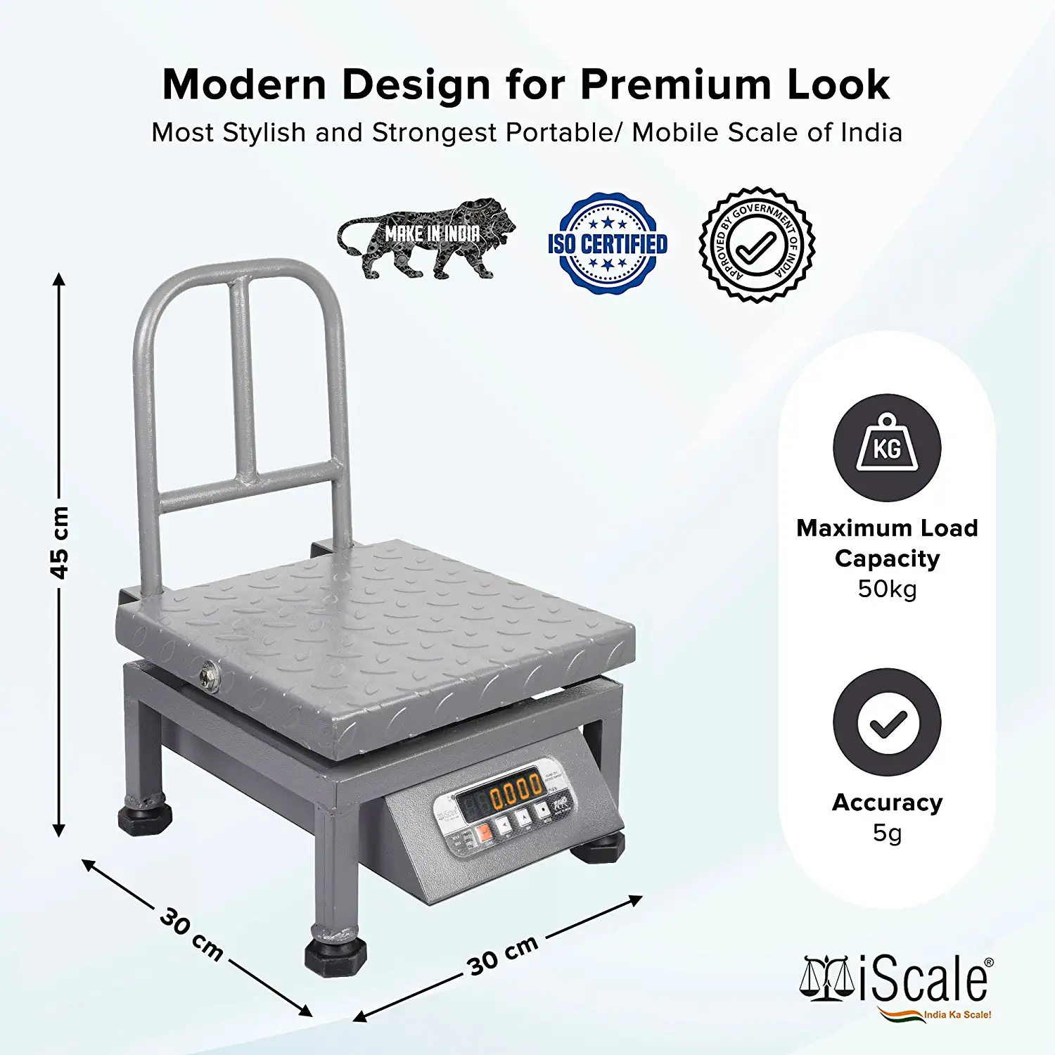 Modern Design for Premium Look.Maximum Load Capacity: 50kg Accuracy: 5g Dimensions with scale: Platform: 30cm x 30cm Strong Handle for the Ease of Mobility Strong Back-grill to hold larger packages. Multi-purpose Portable/ Mobile weighing machine. It Can Be Used in Hardware Shops, All Types Retail Stores, Industries, Warehouses and For All types of Robust Weighing Purposes Can be used anywhere for high accuracy weighing.