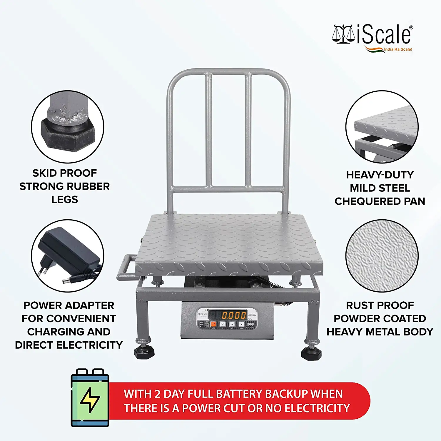 - Directly Plug-in 220V Power Adapter. There is also power backup of 2 days as it has in-built non-spill able lead acid battery. When the power is 100%, the standby time is about 6 months. The scale will also automatically switch to power saver mode when it is in non-use condition, to save power.