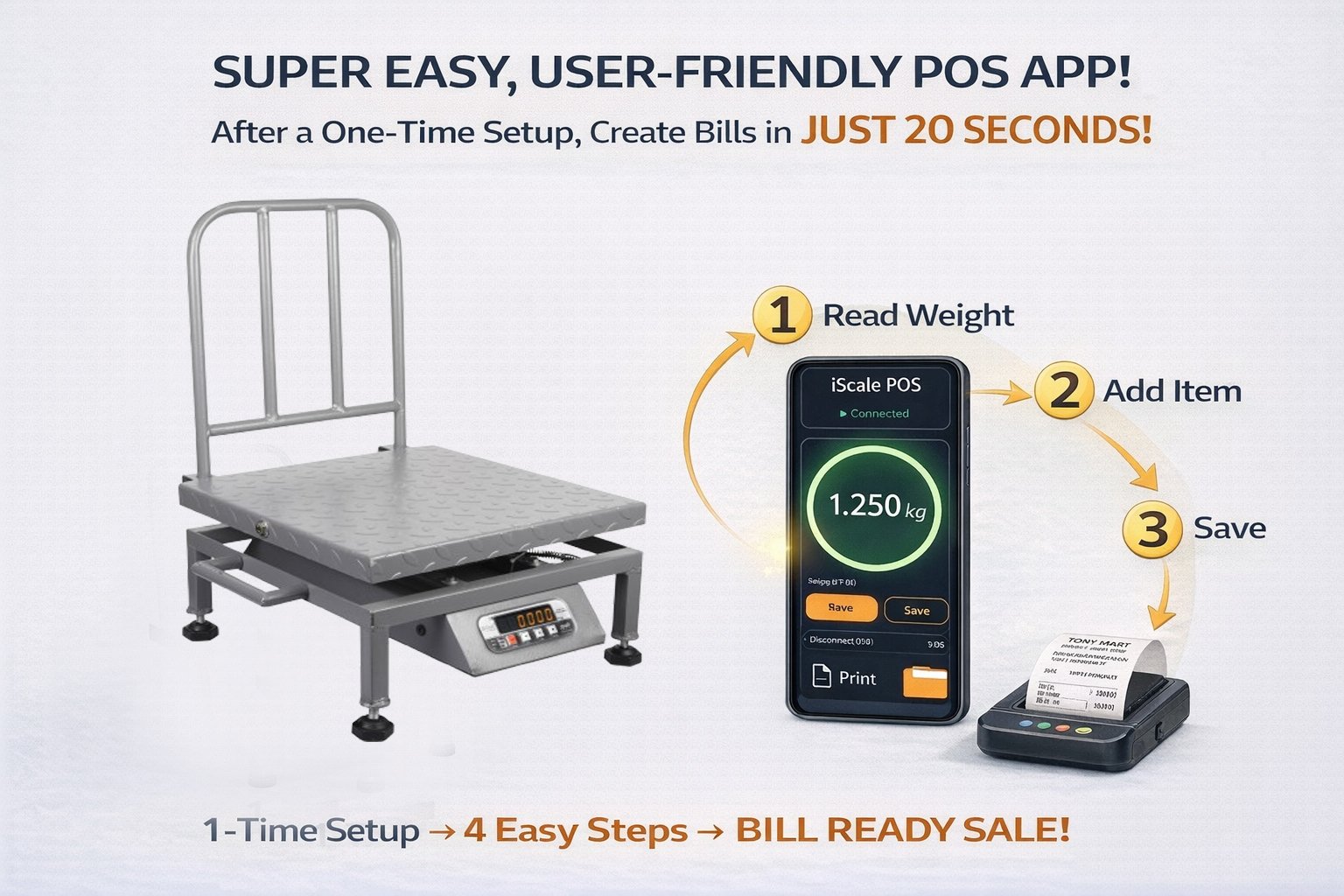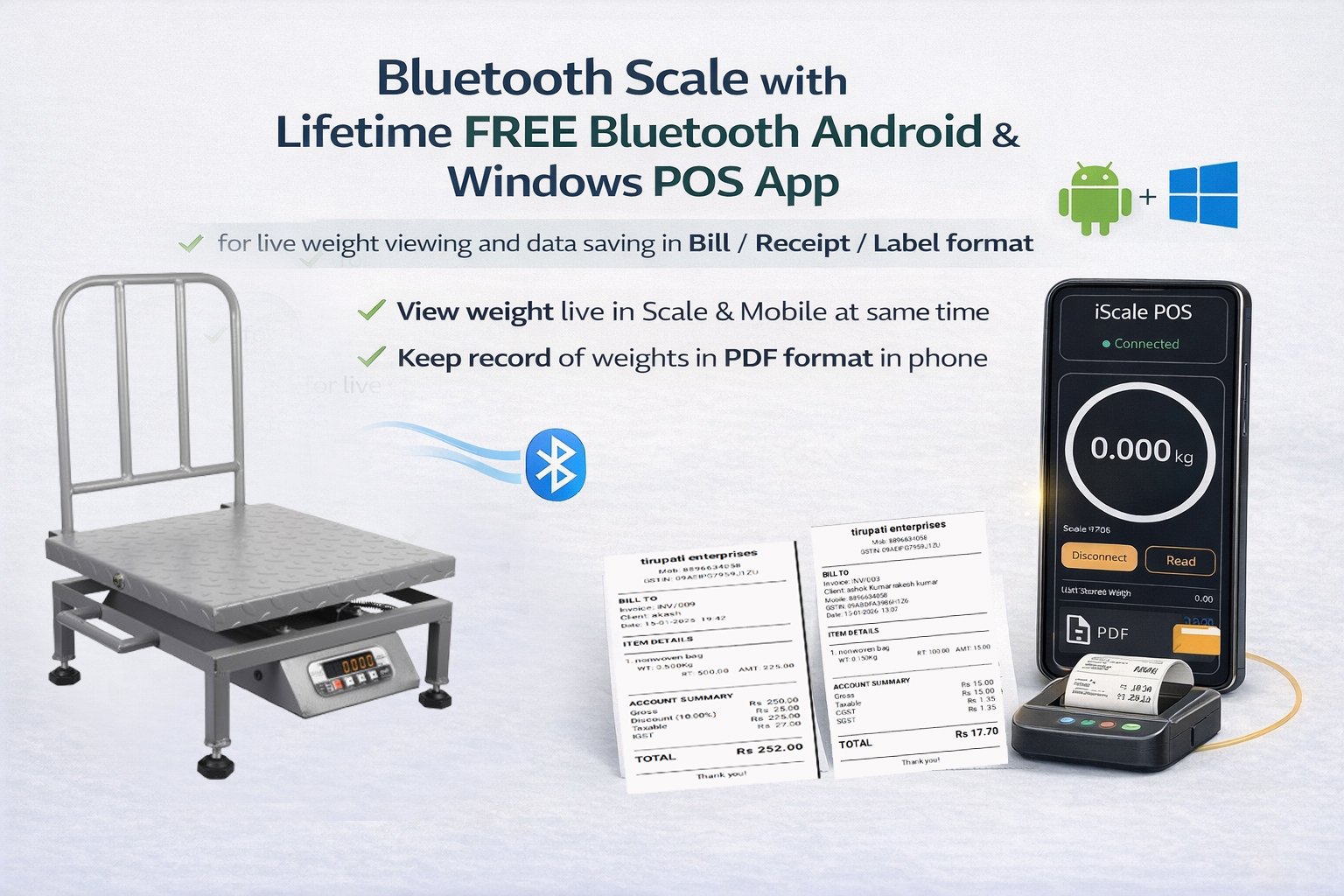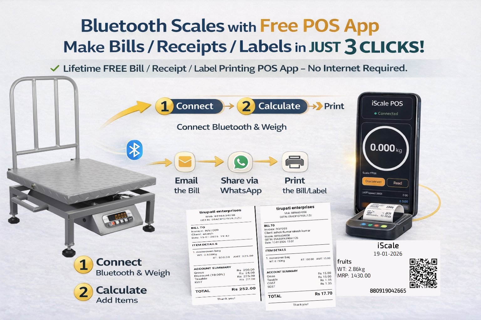 • Bluetooth connectivity for mobile and PC: Displays live weight on Android smartphones and Windows PCs using a lifetime free iScale POS app. Create receipts, invoices and MRP labels within 10–20 seconds in just 3 clicks using an simple-to-use app. Supports printing of bills and labels with scannable QR codes through the same app using a wireless Bluetooth thermal printer (printer not included). Suitable for billing, monitoring and digital record saving.Works completely offline, no internet required.