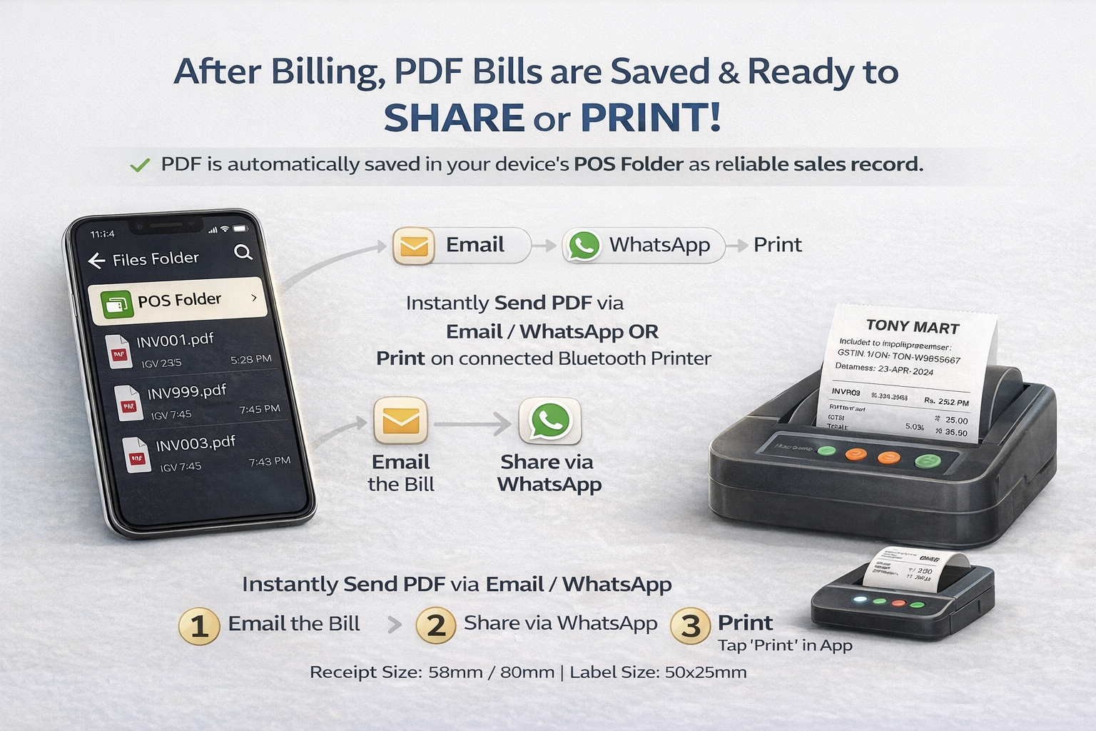 - PDF saving and direct wireless printing via Bluetooth thermal printer (printer not included)